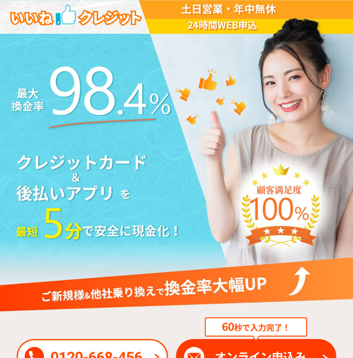 | いいねクレジット | 98.4% | 5分 | 9:00〜18:00 | 手数料完全無料 |
