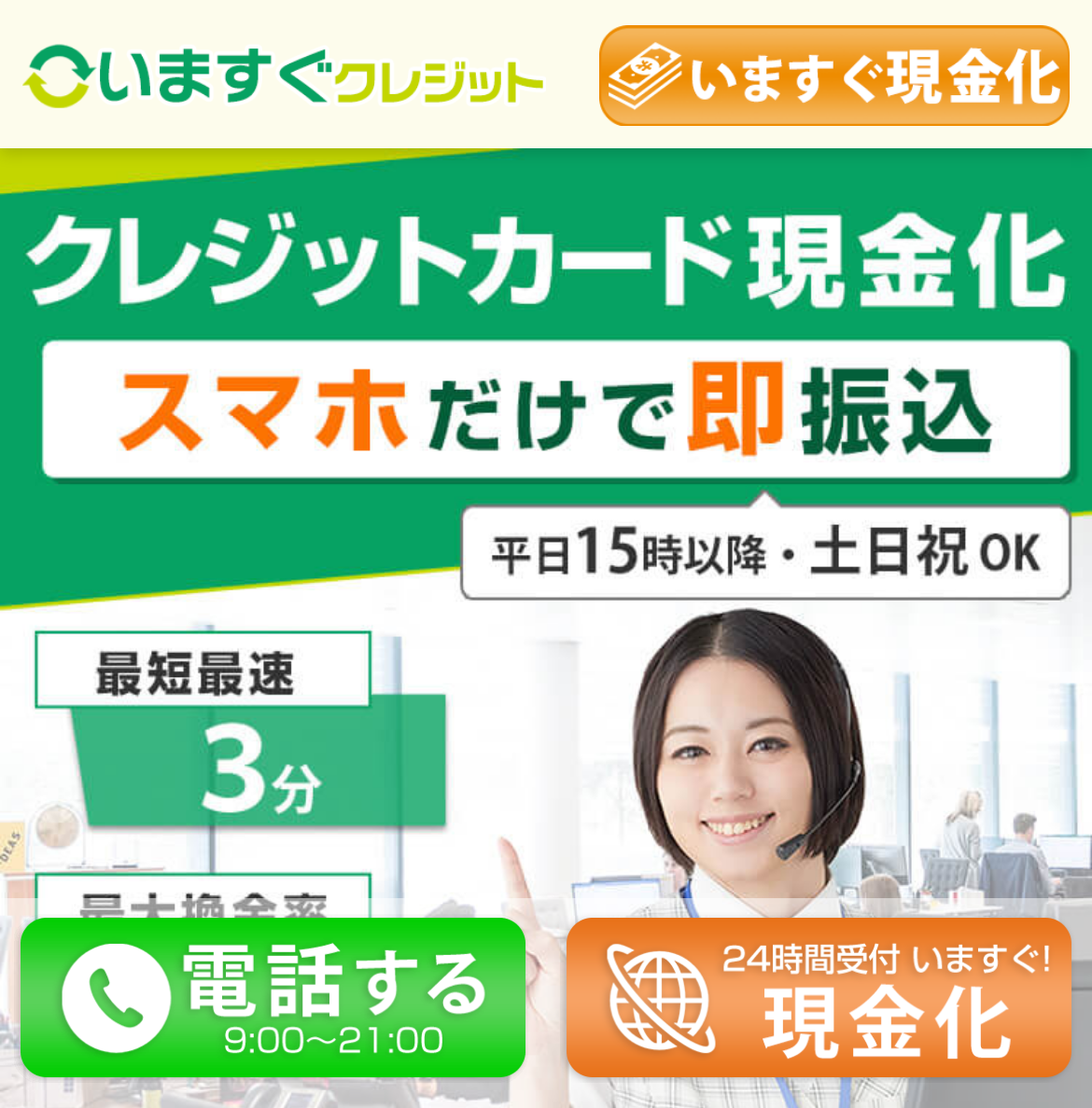 | いますぐクレジット | 99.5% | 3分 | 9:00〜21:00 | 最大3万円プレゼント |
