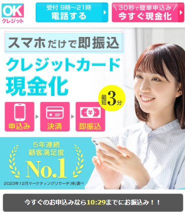 いますぐクレジットは、創業10年を超える老舗でありながら、最短3分という爆速振込を実現している、技術と実績を兼ね備えた業者です。 年中無休で21時まで営業しているため、仕事帰りや土日祝日の緊急事態でも頼りになり、最大3万円のプレゼントキャンペーンなどユーザー還元も積極的に行っています。