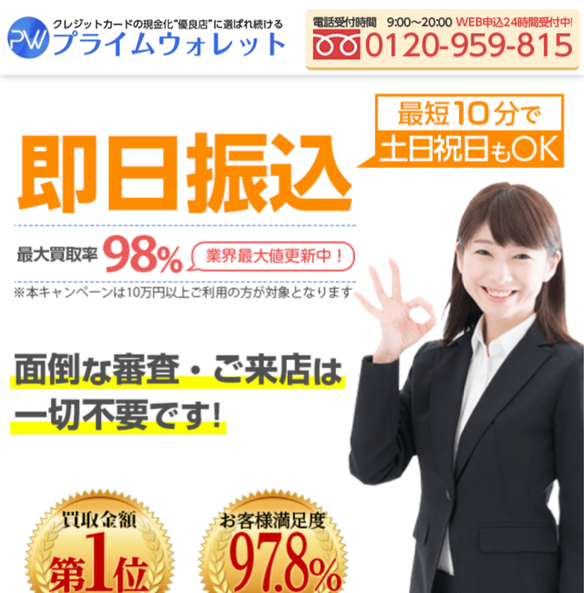 | プライムウォレット | 98.3% | 10分 | 9:00〜20:00 | 大手他社調整あり |