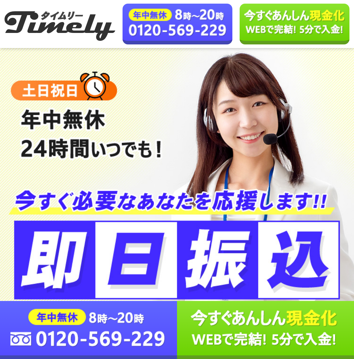 タイムリーはその名の通り、営業時間内であれば最短5分という、業界でも最速クラスのスピード対応を売りにしている業者です。 朝8時から夜20時まで営業しており、早朝の急ぎの用立てや、夜間の支払い不足にもすぐに対応してくれるスピード自慢の体制が非常に心強い存在です。